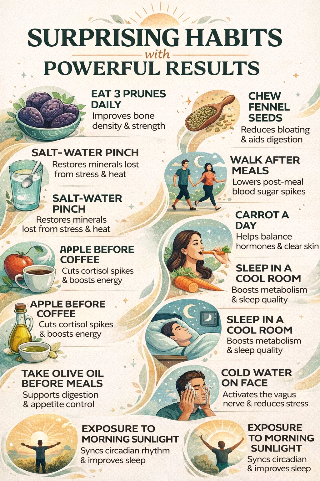 Real health is not always about the big, dramatic gestures. It is found in the quiet moments of the day: the way you breathe, the way you hydrate, and the way you transition between activities. These twelve habits represent a return to intuitive living, backed by modern understanding. By incorporating things like fennel seeds for your gut, sunlight for your sleep, and prunes for your bones, you are taking proactive steps to ensure your body functions at its absolute best. Start small, stay consistent, and watch as these powerful results begin to manifest in your daily life. Your journey to a more vibrant, energized self begins with the very next thing you choose to do.