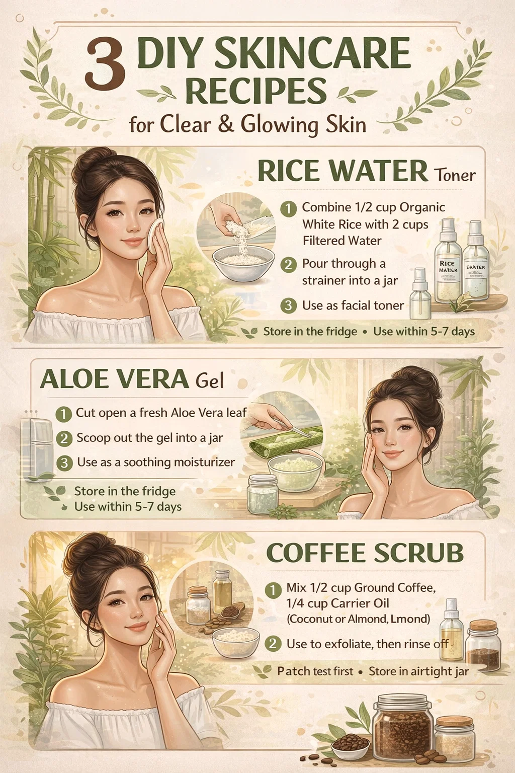 Welcome to a journey where your pantry meets your vanity! There is something immensely satisfying about crafting your own beauty products. It is not just about saving money; it is about taking full control over what touches your skin. You are ditching the complex chemical cocktails for pure, potent, and single-source ingredients. The image we are discussing today is a treasure trove of this exact philosophy, providing us with three phenomenal, time-tested recipes: Rice Water Toner, Fresh Aloe Vera Gel, and a robust Coffee Body Scrub. Let’s dive deep into the secrets of these simple, powerful, and natural skincare solutions.