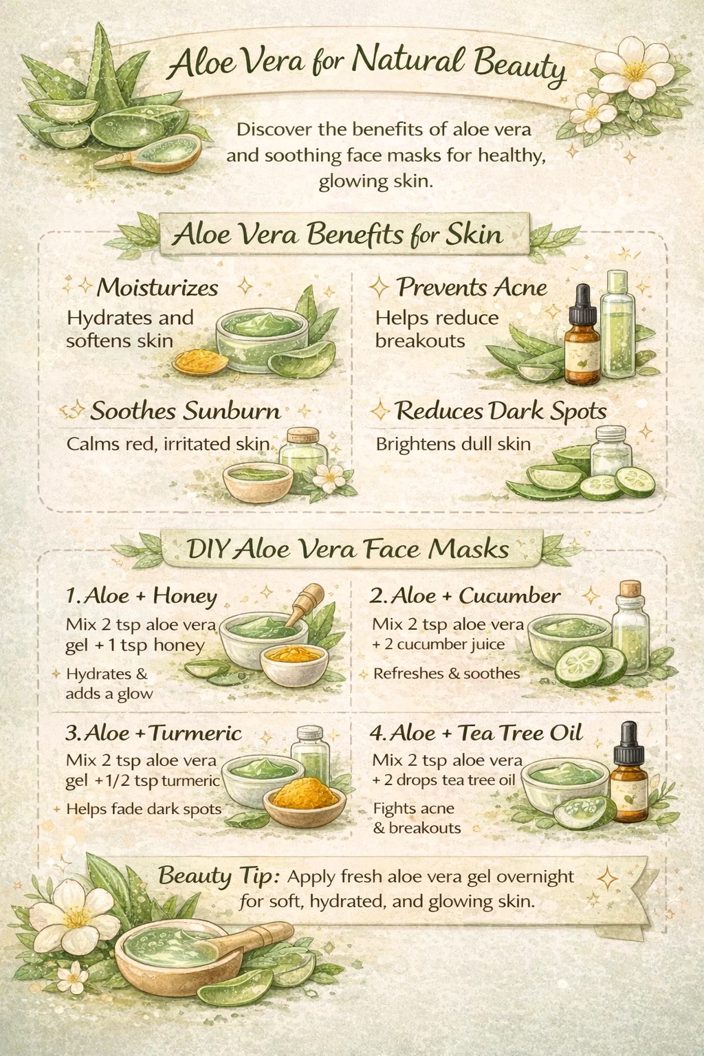 The beauty of aloe vera lies in its ability to play well with other natural ingredients. By creating simple DIY face packs, you can target specific skin issues using items you likely already have in your kitchen. Here are four incredible recipes to get you started on your journey to better skin.
