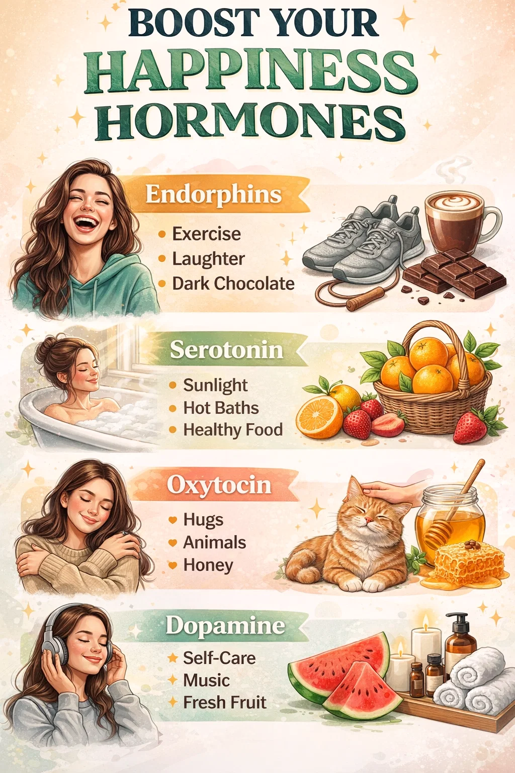 Now that you know how these hormones work, the trick is to integrate them into your daily life without feeling overwhelmed. You do not need to do everything at once. Instead, try to pick one activity for each hormone every day. You might start your morning with a glass of water and some sunlight (Serotonin), head to the gym or have a good laugh with a colleague at lunch (Endorphins), pet your cat when you get home (Oxytocin), and end the night by listening to your favorite album (Dopamine).