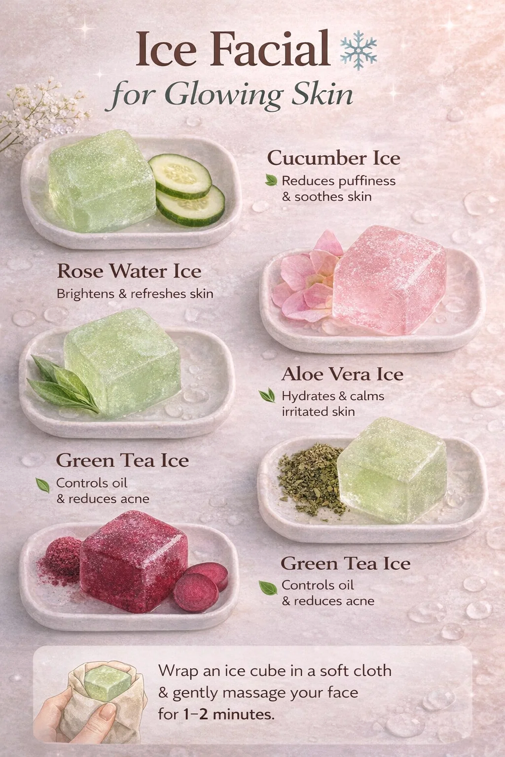In this post, we’re not just talking about splashing your face with cold water. We are diving deep into the art of the sophisticated ice facial, using ingredient-infused ice cubes to deliver potent botanical benefits directly to your skin. The image you see here outlines five fantastic recipes designed to target common skin concerns like acne, oiliness, dullness, and dehydration. Forget about complex or expensive treatments; let’s explore how you can easily create these invigorating face treatments in your own freezer and elevate your skincare routine in just minutes.