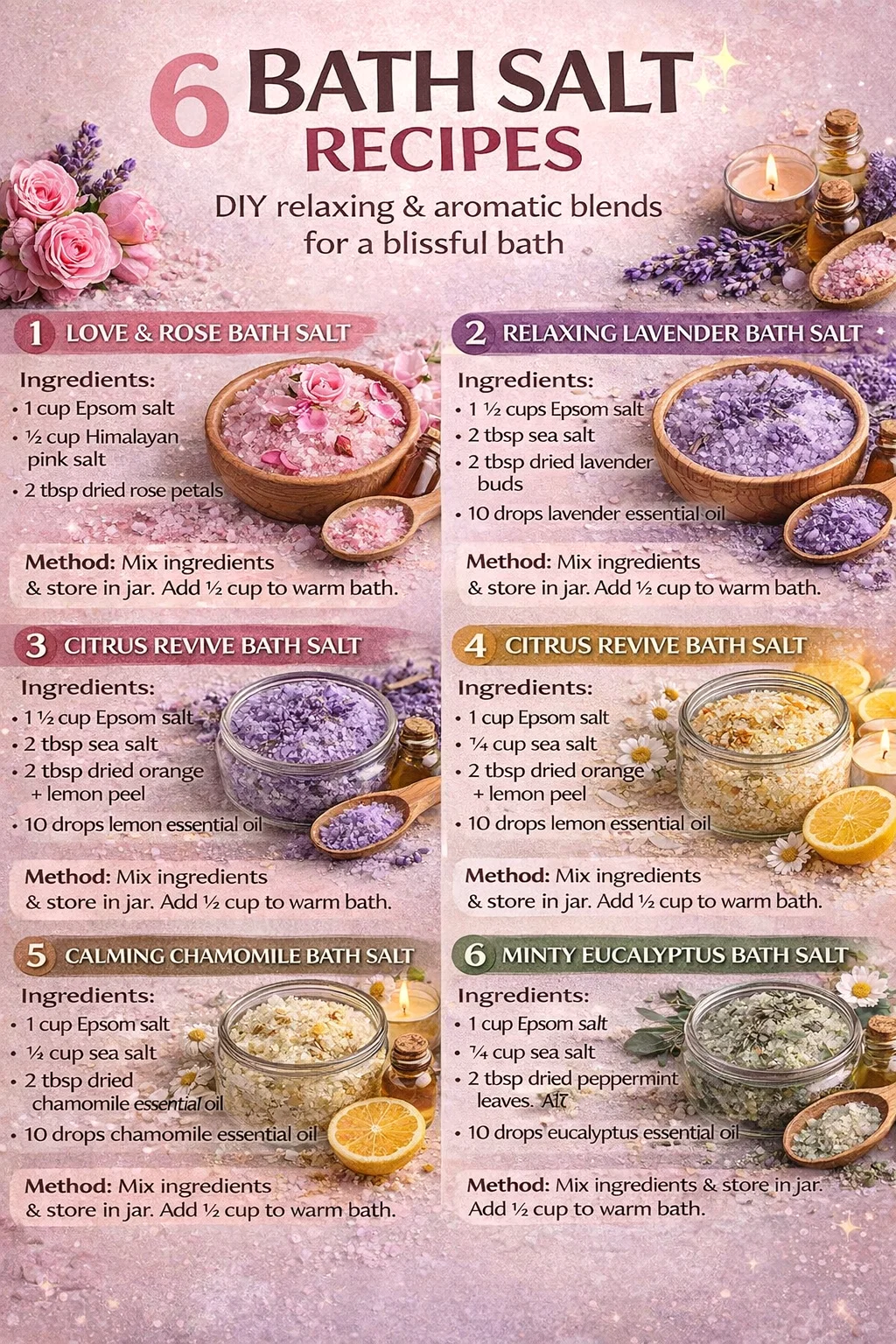 Taking the time to create your own bath salts is an act of self love that goes beyond the bath itself. It is about taking control of your environment, choosing ingredients that nourish you, and honoring the need for rest in a fast paced world. Each of these six recipes offers a unique way to address the stresses of daily life, whether you need the floral embrace of roses or the sharp, clean scent of eucalyptus.
