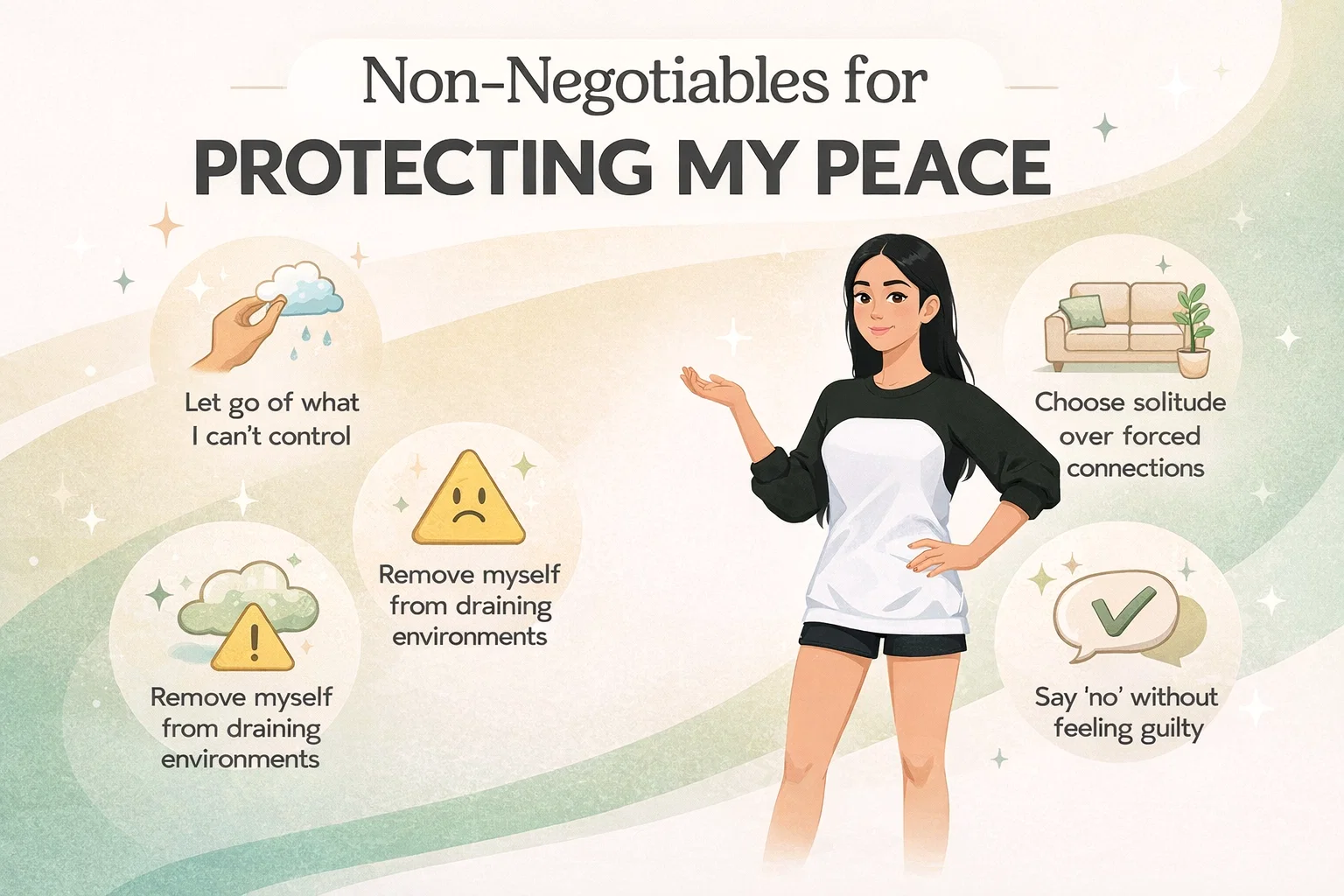 You might find it helpful to write these non-negotiables down in a journal or keep them as a digital wallpaper. The more you remind yourself of these principles, the more they become your default setting. Over time, protecting your peace will become less of a struggle and more of a natural rhythm of your life.