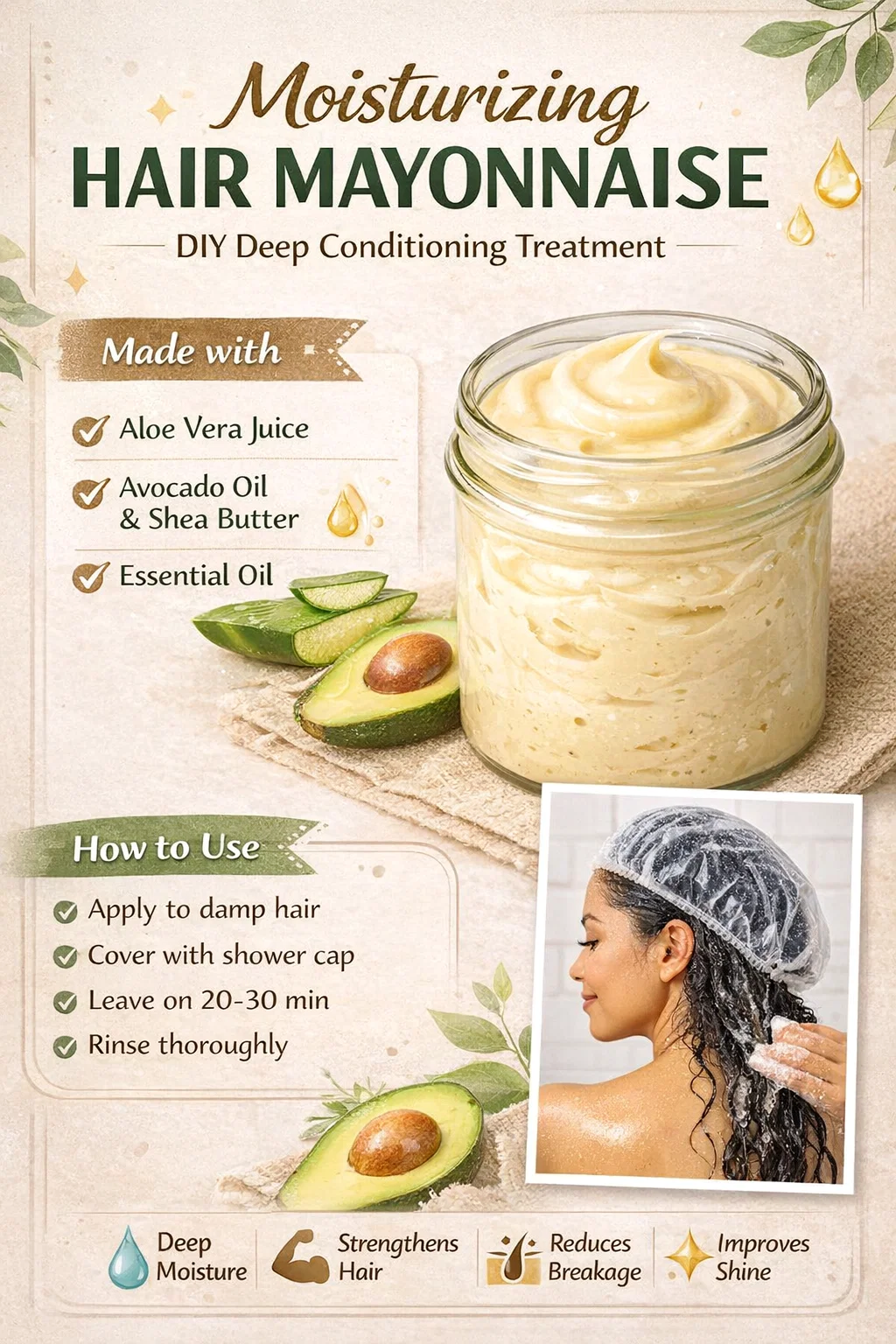 You might be wondering why this treatment is called hair mayonnaise. Traditional mayonnaise is an emulsion of oil and water, and this hair treatment follows that same principle. By using an emulsifying wax, we are able to bond nourishing oils with hydrating water-based ingredients. This creates a creamy, rich texture that penetrates the hair shaft more effectively than a simple oil rub. The goal of this specific recipe is to address the two main needs of healthy hair: hydration to prevent dryness and protein to maintain structural integrity.