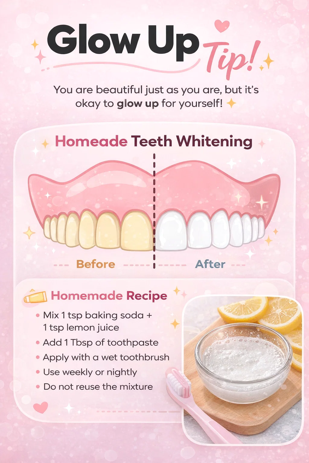 Embracing a glow up is a wonderful way to boost your confidence and practice self care. The DIY teeth whitening hack of baking soda and lemon juice is a testament to the creativity of the beauty community. It offers a quick, budget friendly way to brighten your smile for those special occasions or as part of a weekly pampering session. However, the most important takeaway is to listen to your body. If you feel any zingers or increased sensitivity, take a break and focus on gentle care.