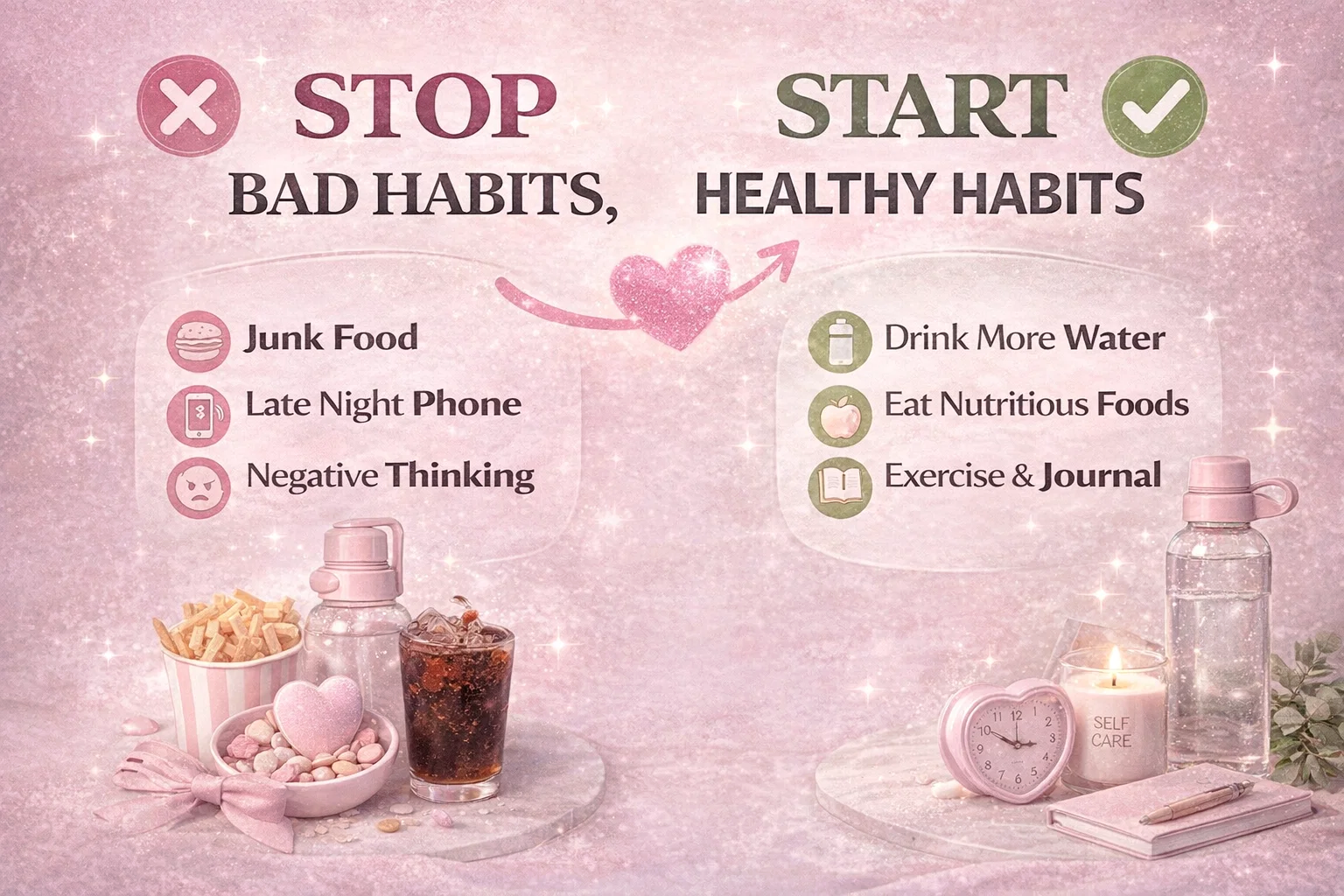 - Start Small: Pick just two things to stop and two things to start this week. For example, commit to drinking more water and reading ten pages of a book, while cutting out late night scrolling and soda.