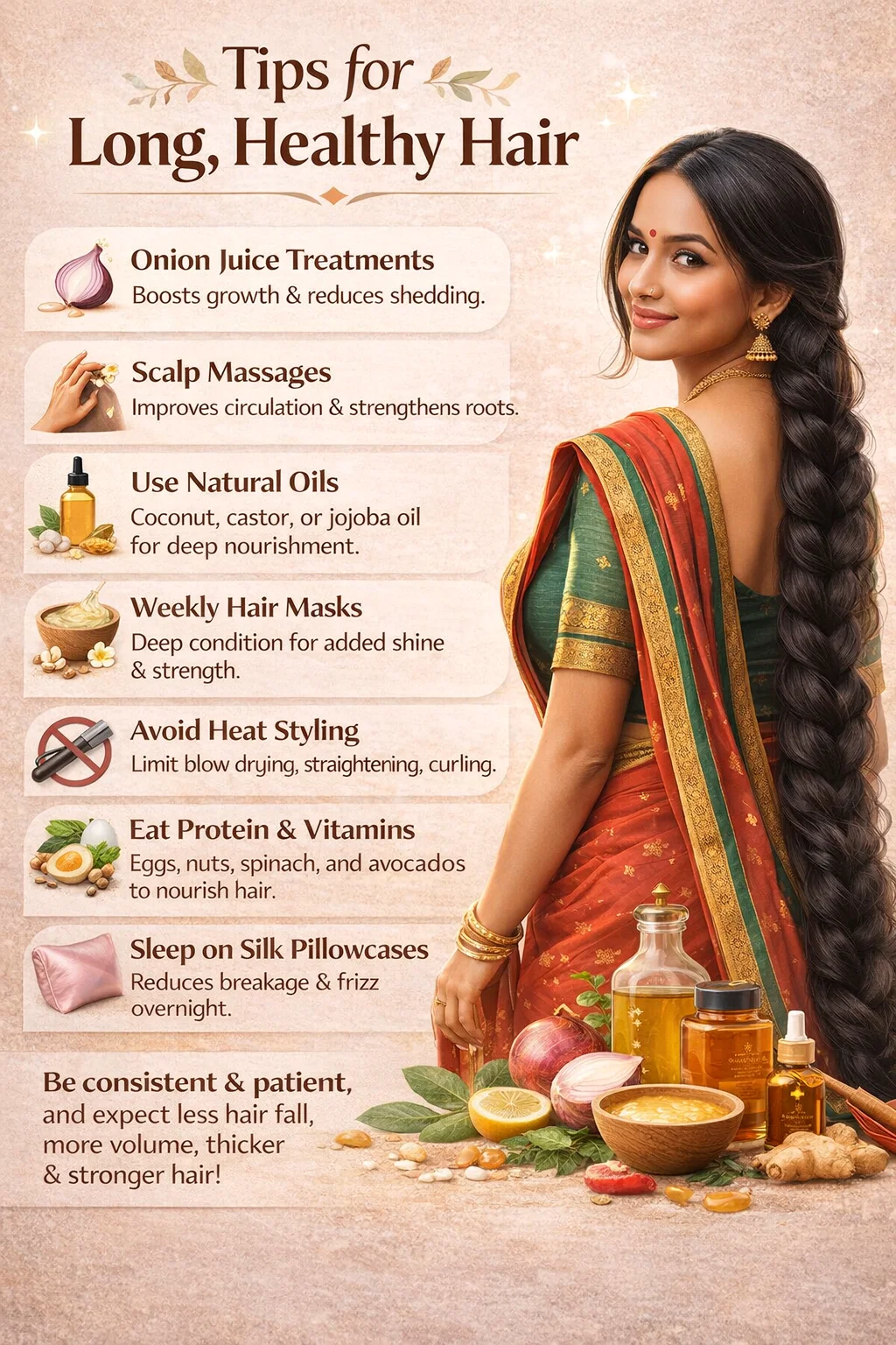 The image of the woman with the long, dark braid serves as a beautiful inspiration. It reminds us that healthy hair is a combination of heritage, nature, and discipline. By following these tips—from the sulfur-rich onion juice to the gentle protection of a silk pillowcase—you are setting yourself up for success. Remember to be kind to your strands, stay hydrated, and enjoy the process of watching your hair grow stronger, thicker, and longer every day. Your future self with waist-length locks will certainly thank you for the effort you put in today.