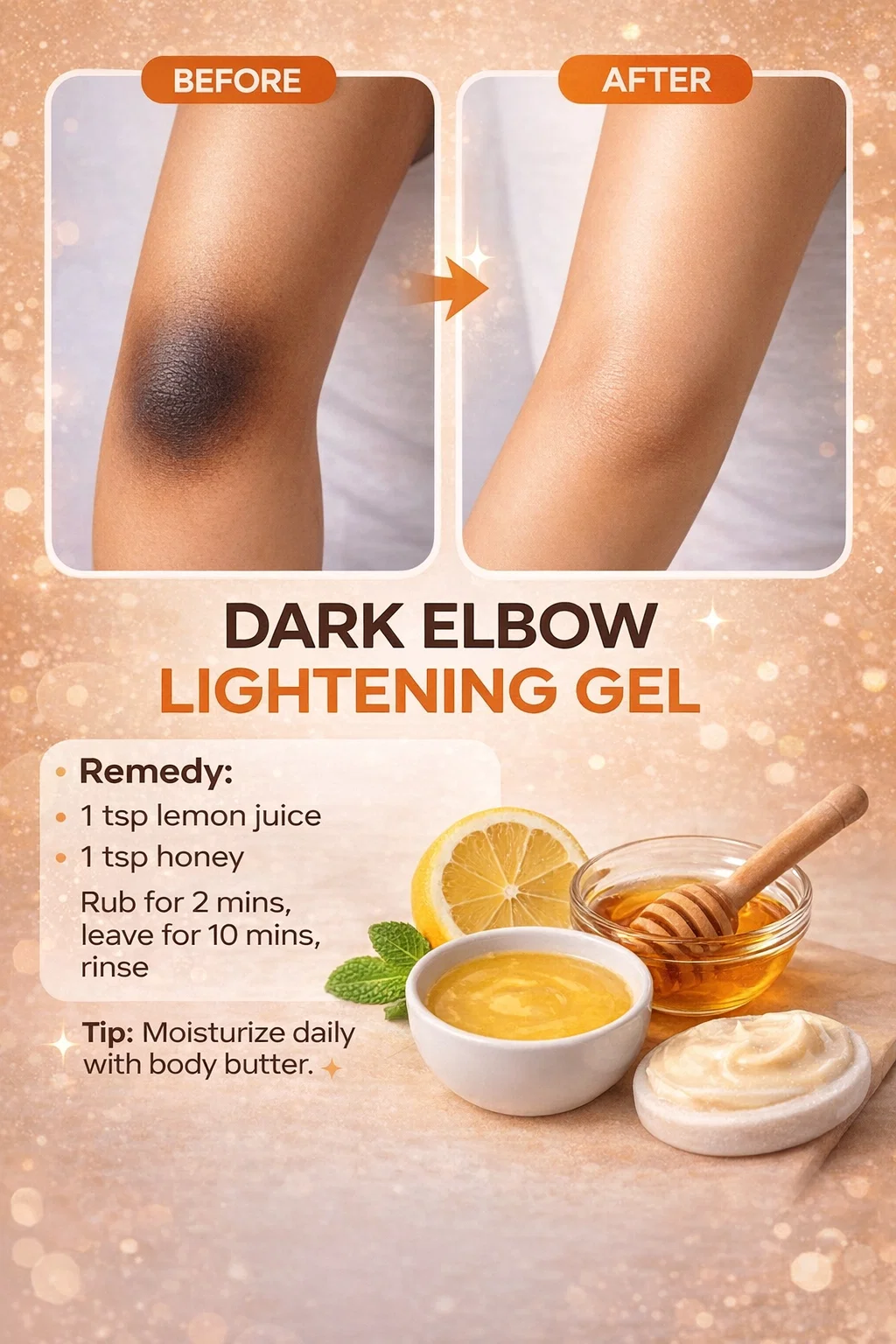 Achieving glowing, even toned skin is a journey of patience and self love. Dark elbows are a completely natural part of being human, but if they make you feel less than confident, you have the power to change them using simple tools from your own home. By combining the brightening properties of lemon with the soothing moisture of honey, and backing it up with a solid moisturizing habit, you can easily transition from the shadowed “Before” to the radiant “After” shown in the guide. Start your routine tonight, stay consistent, and get ready to flaunt those smooth elbows with total confidence!