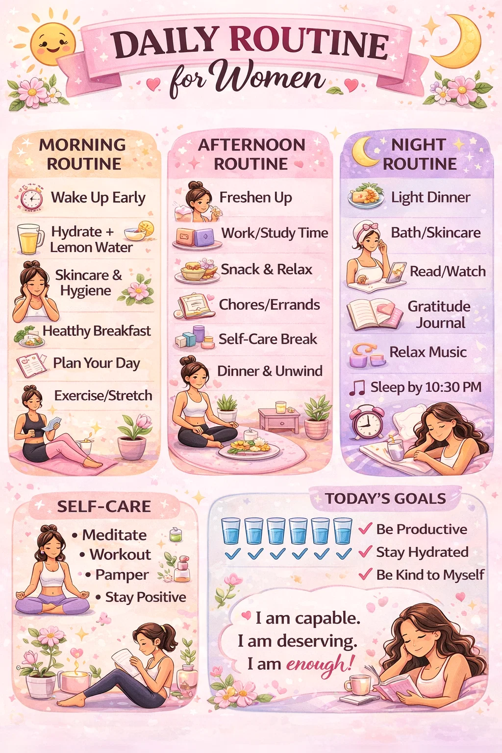Sleep is the pillar of health. Aiming to be in bed and asleep by 10:30 PM ensures that you get the recommended seven to eight hours of rest. Consistency is key here. When you go to bed and wake up at the same time every day, you regulate your circadian rhythm, making it easier to fall asleep and wake up naturally. A well-rested woman is a capable, patient, and creative woman.